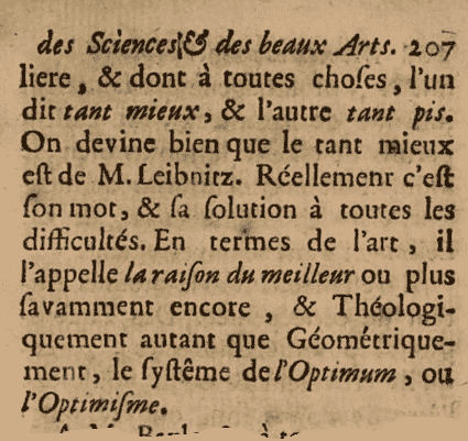 Ĉi tio estas la unua uzo de la vorto «optimismo» rilate al la Lejbnica «Teodiceo». Kaj malgraŭ la aserto de la recenzo, la sola apero de la literĉeno optim en la propre Lejbnica teksto estas la ĵuse citita.