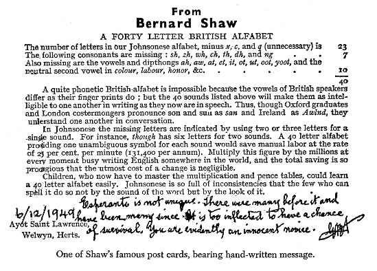 Shaw replied on the 6th with one of his printed propaganda postcards advocating his alphabet, to which he had added in his own hand: