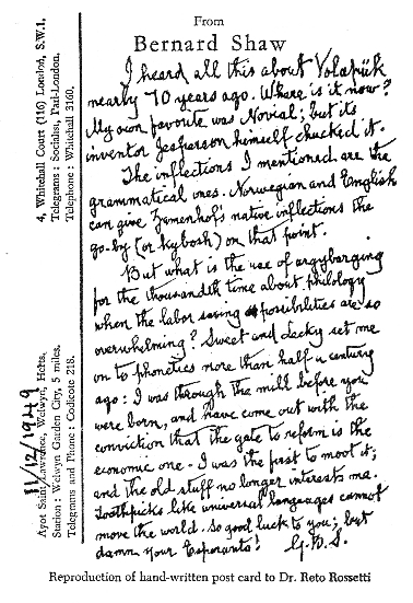 In a letter to the Listener of 1st December, 1949, Shaw advocated a phonetic 40-letter “British alphabet” and some type of pidgin English for international use. On 4th December Reto Rossetti sent him a copy of his open letter to Mr. Robert Birley, who had stated in his third Reith Lecture, that artificial languages “had no literature”. In this R.R. said: