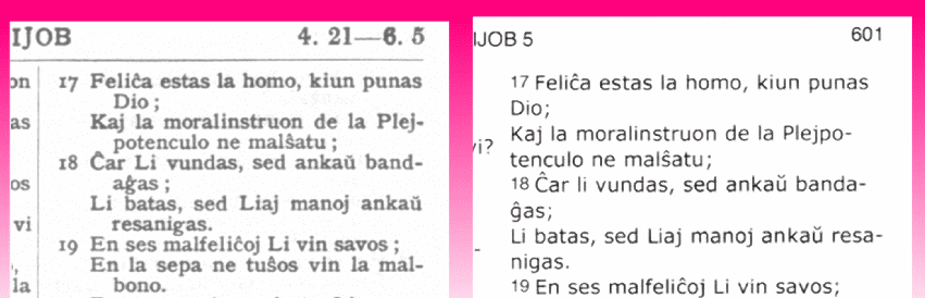 La duakanonajn partojn ni — kun la permeso de la tradukinto — envicigis en la Malnovan Testamenton laŭ la maniero de la Vulgato. Ili estas facile ekkoneblaj pro la kursivaj literoj …La versiklojn ni ĝenerale nombris [t.e. numeris — S.P.] laŭ la Nova Vulgato de 1979. Kie la ĝisnuna esperanta teksto havas alian nombradon [t.e. numeradon — S.P.], ni signis la koncernajn versiklonumerojn per steleto (*).